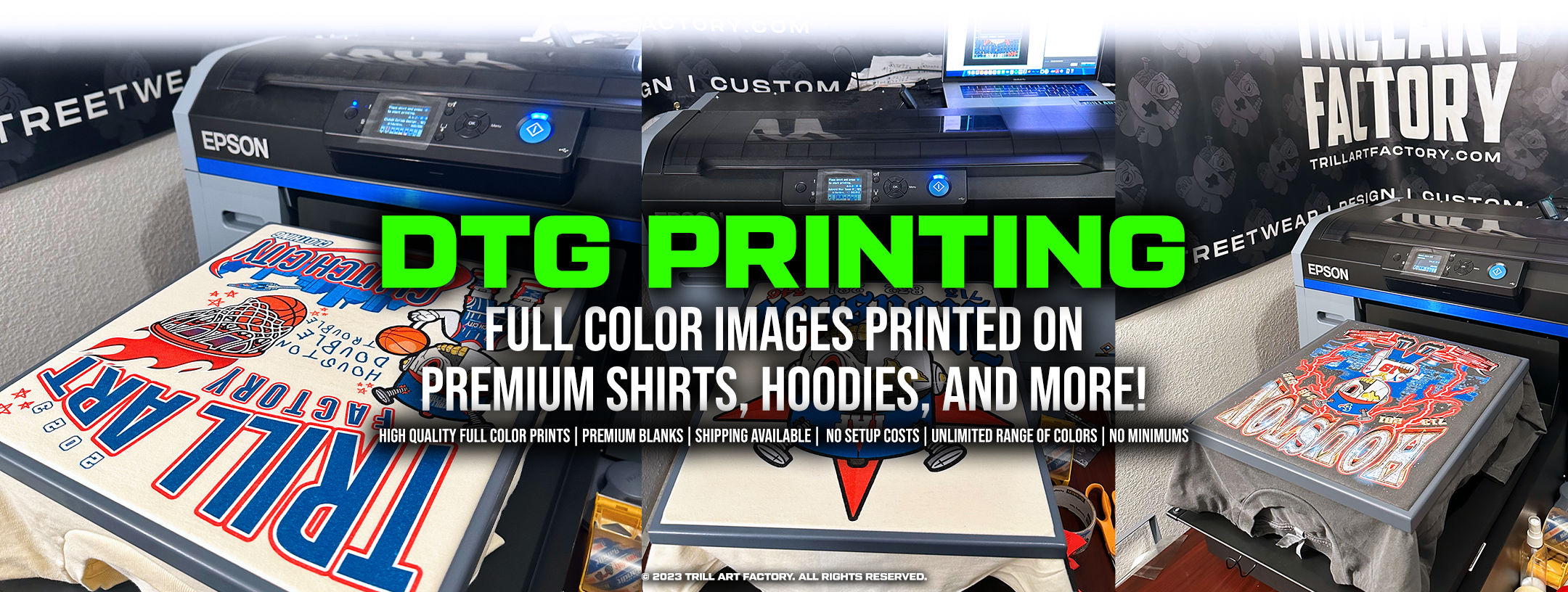 Direct to Garment (DTG) printing uses water based CMYK ink to print your digital artwork directly onto a garment. DTG is the perfect print method for designs with high color, transparency, gradients, and photorealistic images. It can print any transparency, or color blends smoothly.